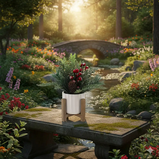 11" Artificial Christmas Tabletop Tree | Red Berries & Pine in White Ceramic