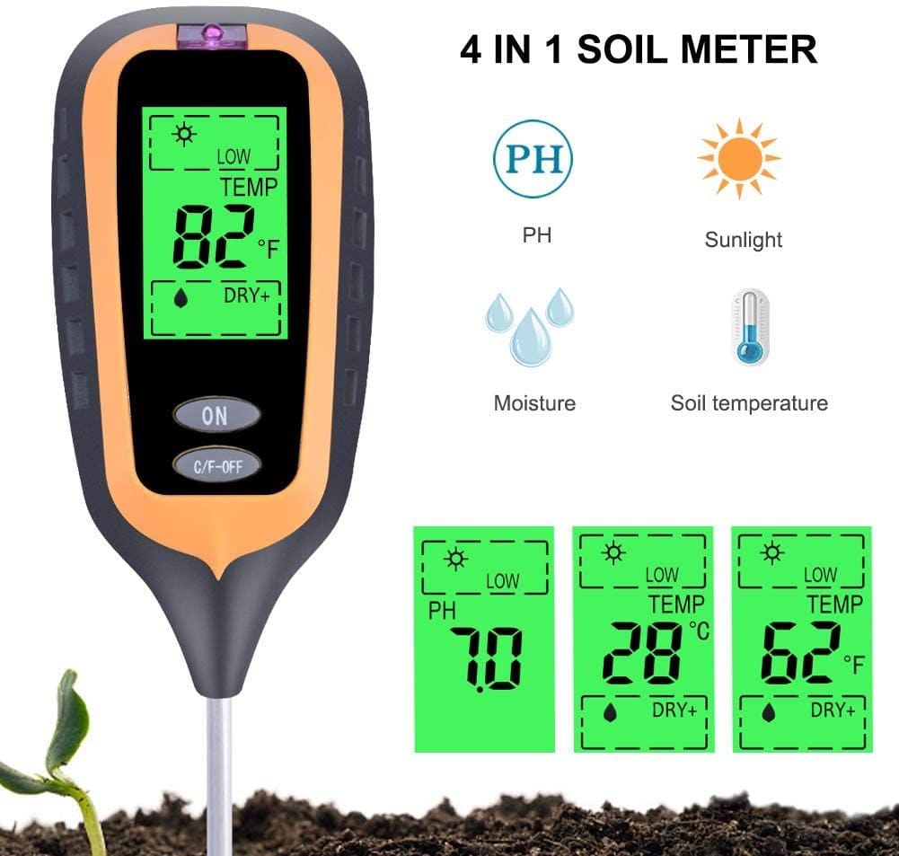 This soil moisture, pH, temperature, and light tester offers 4 important measurements: pH Value, Temperature, Moisture, and Environment Sunlight Intensity.