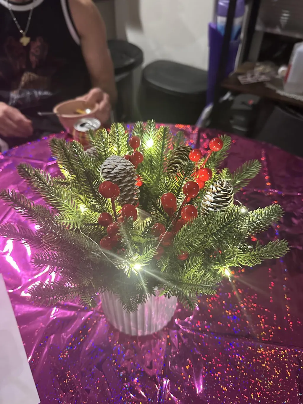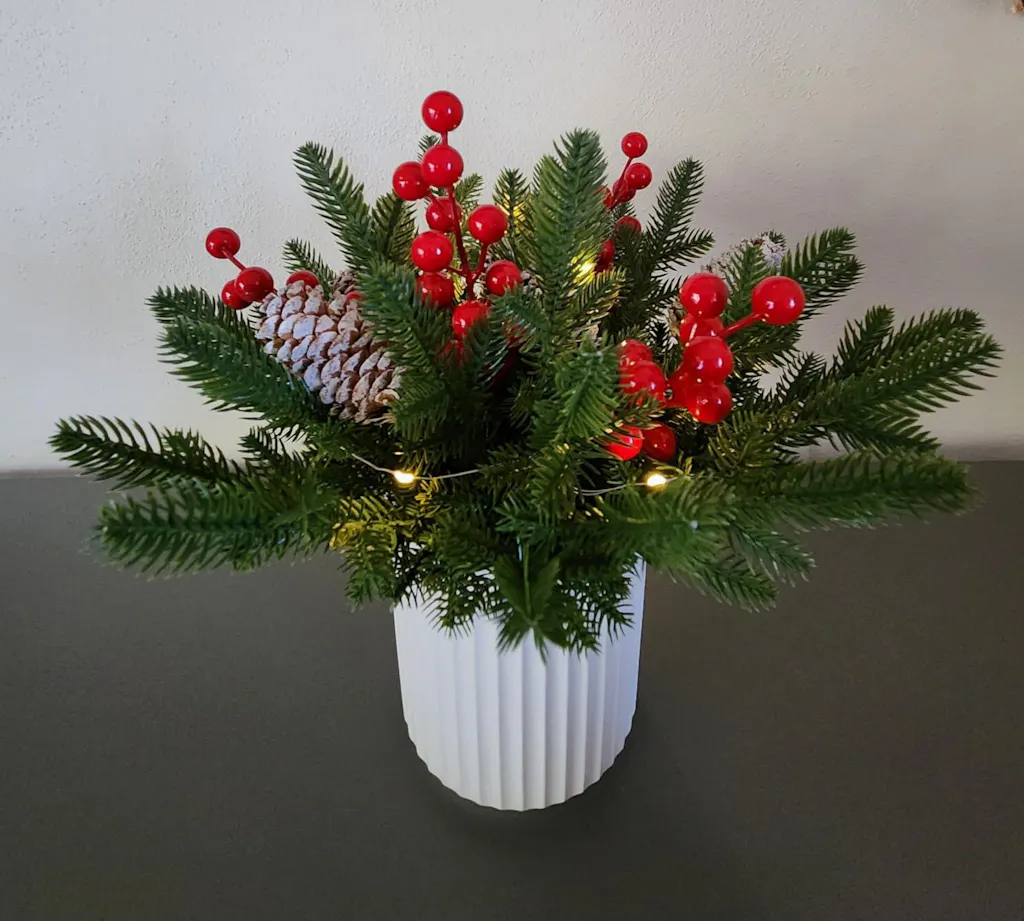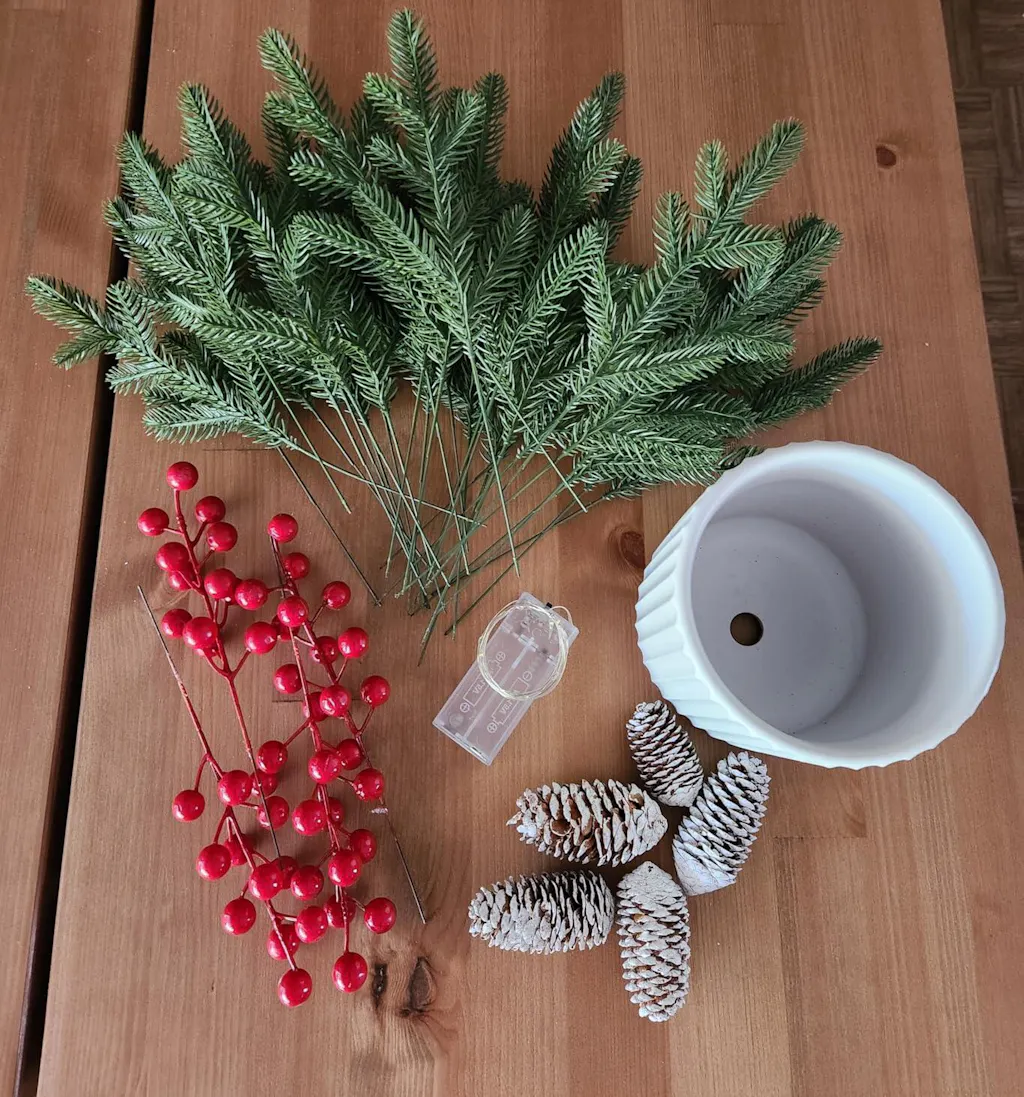 This isn't a blob of cheap greenery glued into a pot! This is 30 stiff, realistic pine picks that don't need floral foam or glue to stay upright. The berry picks, pinecones, and light string are optional but are just enough to turn this into a display that looks like it cost twice as much. The battery box for the lights has an on/off switch (no timer), and to keep it out of the way, I simply taped it to the back of the pot.
