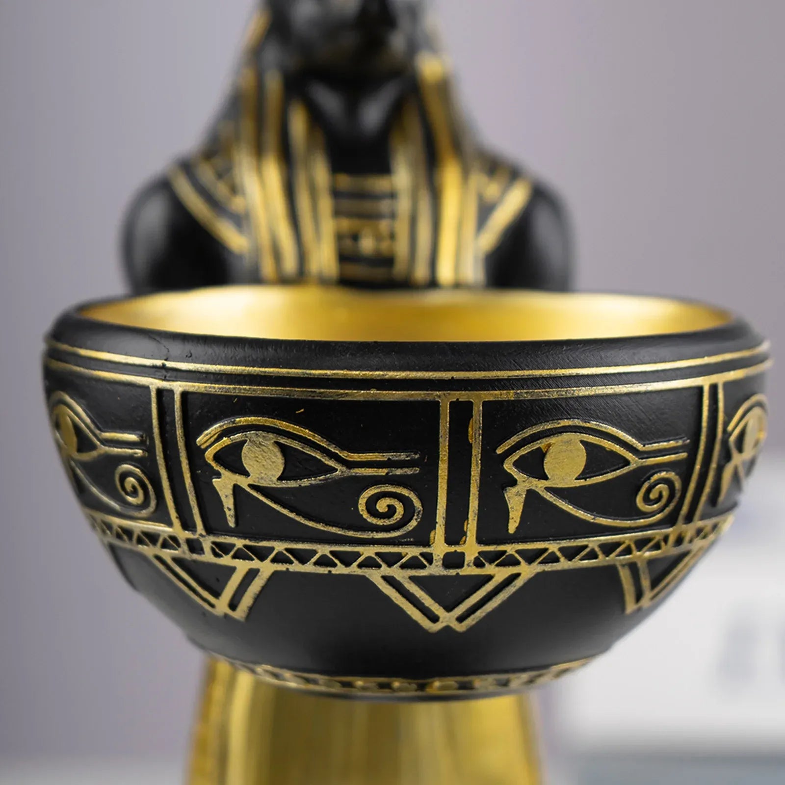 Crafted from high-quality resin with rich black and gold accents, the sculpture showcases intricate Egyptian-style patterns and a regal design that reflects the grandeur of ancient Egyptian art. The bowl held by Anubis adds a functional element, making this piece both decorative and useful.