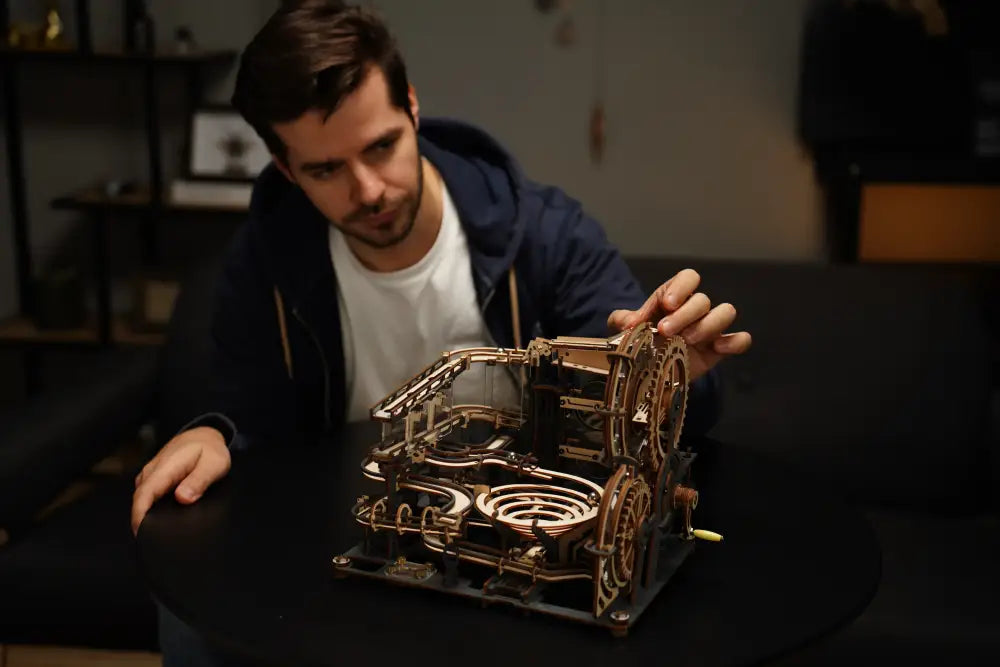 Challenge yourself with the mesmerizing Marble Run Set (Night City), a complex and rewarding 3D Wooden Puzzle DIY Model. This engaging construction kit allows Teens and Adults to build a fully functional kinetic sculpture that moves marbles through an intricate network of gears, slides, and tracks.