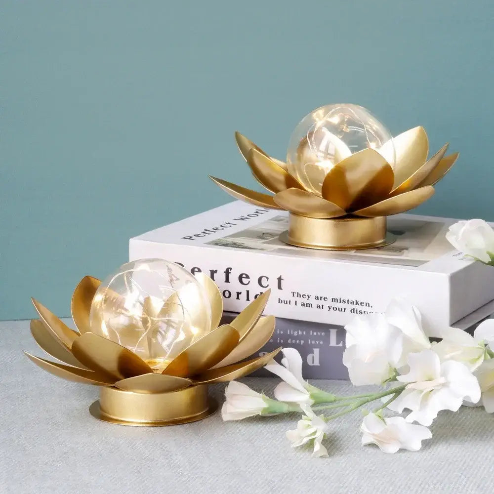 Bring a touch of botanical elegance to your home or special event with the Gold Lotus Table Lamp Set. Each lamp is meticulously crafted from high-quality iron with a polished finish, standing at a compact 6 inches tall.