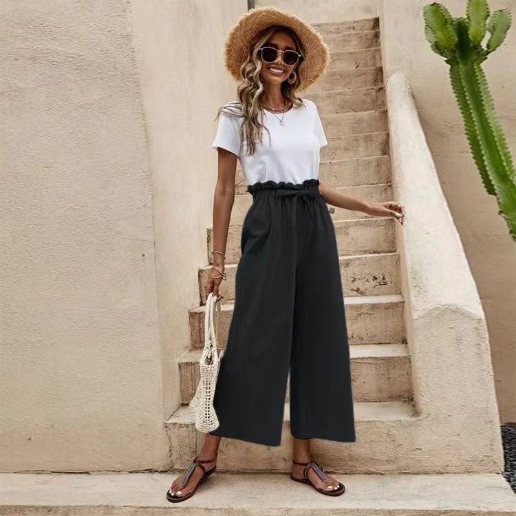1 x Women's Solid Color Elastic Waist Belted Wide Leg Pants