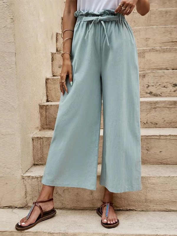 Women's Solid Color Elastic Waist Belted Wide Leg Pants